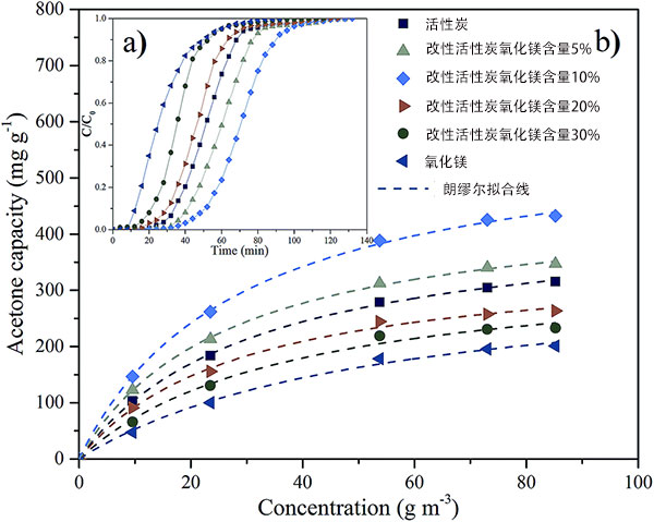 圖4、(a)突破曲線和(b)丙酮在具有不同氧化鎂含量的純氧化鎂和改性活性炭上的吸附等溫線。