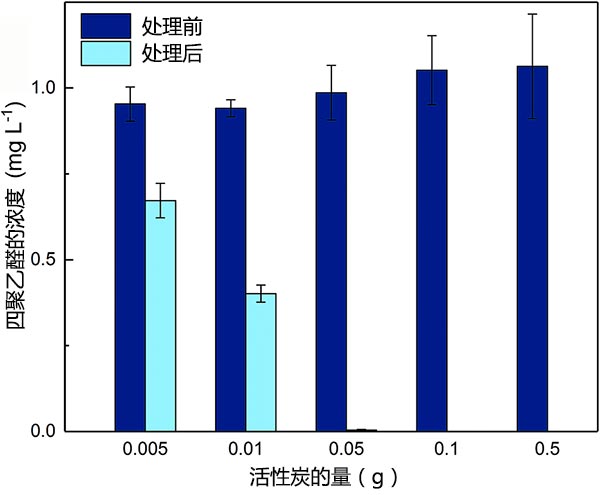圖2顯示了在不調(diào)節(jié)單一體系中的聚乙醛溶液的pH的情況下處理前后的四聚乙醛濃度。可以看出,有效地除去了聚乙醛,特別是在活性炭劑量較高的情況下。單因素統(tǒng)計(jì)檢驗(yàn)證實(shí),在活性炭處理2小時(shí)之前和之后,乙醛濃度之間存在顯著差異(p<0.05)。當(dāng)活性炭用量從0.005g增加到0.05g時(shí),去除甲醛的百分比從30.3%增加到99.6%。當(dāng)PAC用量高于0.05 g時(shí),處理后未檢測到乙醛,表明其濃度低于檢測到的聚乙醛(1~5μgL-1)。