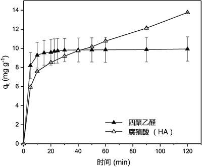 圖4:在單吸附系統(tǒng)中2小時(shí)內(nèi)PAC對聚乙醛和HA的吸附比較。