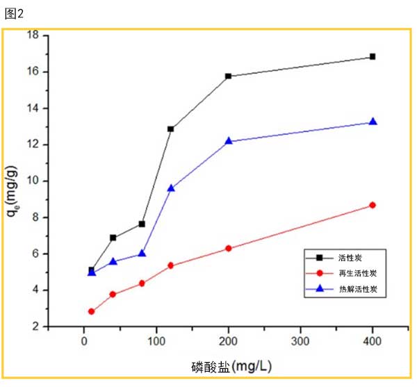 為了評估再生活性炭的性能,研究了磷的吸附性能。在該研究中,通過改變磷酸鹽的初始濃度(20℃)來測試活性炭,再生活性炭和它的吸附容量。圖2顯示了一般趨勢,即吸附容量隨初始P濃度的增加而增加,直至達(dá)到飽和狀態(tài)。