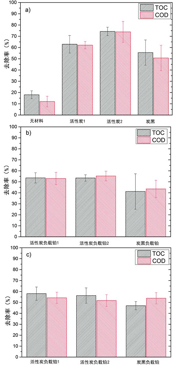 圖1:反應4小時后魚罐頭廢水的APR去除TOC和COD,a)批次運行中的活性炭與活性炭負載鉑催化劑b)分批運行和c)半連續(xù)運行。