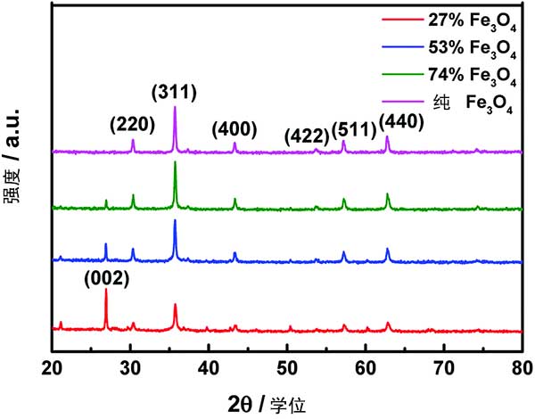 使用XRD衍射儀測(cè)量活性炭復(fù)合物的晶體結(jié)構(gòu)。圖1顯示了所制備樣品的衍射圖案。在2的特征衍射峰θ= 31.24°,36.82°,44.76°,55.62°,59.30°和65.19°的與(220),(311),(400),(422),(511)和(440)Fe 3 O 4平面一致。此外,在約2峰值θ=26.20°被分配給蓬松結(jié)構(gòu)化活性炭。觀察到Fe 3 O 4衍射峰的強(qiáng)度隨著Fe 3 O 4納米顆粒負(fù)載量的增加而增強(qiáng),并且活性炭的強(qiáng)度在相同的過(guò)程中減少。上述現(xiàn)象表明Fe 3 O 4納米顆粒可以成功地引入蓬松結(jié)構(gòu)的活性炭上。
