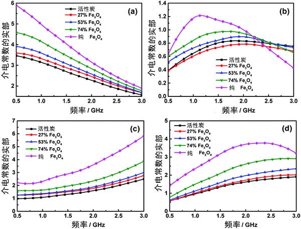 此外,研究了活性炭復(fù)合材料的電磁波吸收性能。圖4顯示復(fù)介電常數(shù)和導(dǎo)磁率,這些電磁參數(shù)對(duì)于確定微波吸收復(fù)合材料的介電和磁損耗非常重要,并且在吸收過(guò)程中電磁波的傳輸和反射也受它們的影響。從圖6(a)和(b)中,可以觀察到,所有樣品的介電常數(shù)的實(shí)部與增加頻率。圖6(c)和(d)顯示了磁導(dǎo)率的實(shí)部和虛部作為頻率的函數(shù)。觀察到當(dāng)活性炭的負(fù)載量低時(shí),滲透率的實(shí)部?jī)H略微增加。