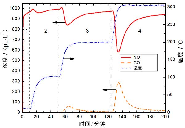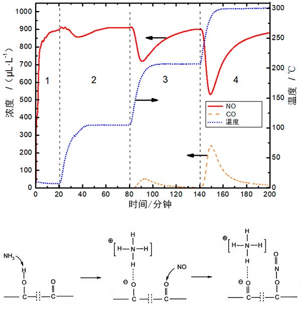 當(dāng)溫度低于300℃時(shí),作為還原劑的活性炭的脫硝能力差。為了進(jìn)一步提高活性炭的脫硝能力,NH 3通常加入作為還原劑。如圖3所示,當(dāng)入口氣體為1000μL/ L NO +1000μL/ L NH 3時(shí),研究了活性炭在不同溫度下的脫硝能力。本文使用的煤質(zhì)活性炭是酸性的,含酚羥基的官能團(tuán)相對(duì)較高,促進(jìn)了脫硝。它可以從之間的比較可以看出圖2和圖3中,加入NH后的趨勢(shì)和CO的濃度3基本上相同,而不NH 3,表明NH 3對(duì)含氧官能團(tuán)的分解沒有效果。