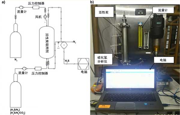 在設(shè)計為0.3米長的實驗室規(guī)模的單吸附塔單元中檢查六種活性炭對硫化氫的吸附性能。每種活性炭的高度指的是不同的活性炭載荷,分別為0.032kg,0.105kg和0.155kg。通過單次進料H 2 S/N 2(1000 ppm H 2 S余量N 2)或H 2 S/N 2/CO 2(1000 ppm H 2)的混合氣體觀察吸附性能。圖1(A)和圖1(B)分別顯示了硫化氫吸附系統(tǒng)的示意圖和實際照片。