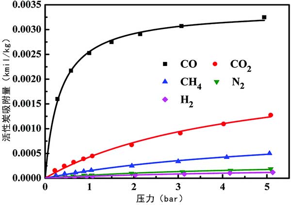 圖2給出了純CO,CO 2,CH 4,N 2和H 2在活性炭吸附劑上的吸附平衡等溫線,操作溫度為30℃。顯然,活性炭具有較高的可逆CO吸附能力。并且可以優(yōu)先吸附CO超過CO 2,CH 4,N 2和H 2,這歸因于高度分散的CuCl和CO之間通過π-絡(luò)合和較弱的范德華力和CO 2的靜電相互作用之間的較強(qiáng)相互作用,CH 4,N 2和H 2用吸附劑。