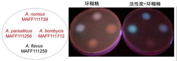 黃曲霉素本身也可以被檢測到,因為它們在紫外光下會發(fā)出熒光。但是,這種方法并不常用,因為紫外光無法檢測到少量的AFS。使用活性炭和環(huán)糊精共同處理的改良添加方法可提高AFS衍生熒光的可見度(圖1)。改善的可見性可歸因于活性炭添加減少了來自培養(yǎng)板表面的紫外光的反射和散射的情況。此外,活性炭添加可刺激AFS產生,從而增加AFS熒光并改善其可見度。然而,活性炭添加影響AFS產生的機制仍然不清楚,對產量增加的具體特征也是如此。用于該方法的活性炭產品具有不同的特性(表1)。這可能對該方法的再現(xiàn)性產生不利影響。