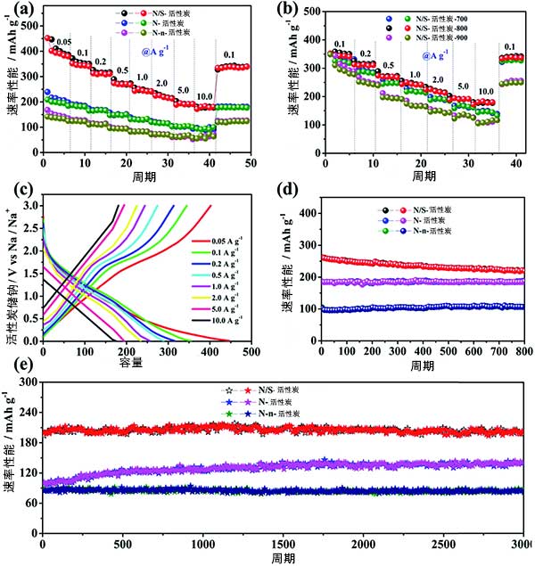 為了進一步描述制成活性炭的電化學行為,進行循環(huán)伏安法和恒電流充電放電測試。為了證明活性炭的優(yōu)點,還在相同的質(zhì)量負載下測試了幾種活性炭的Na儲存性能,圖2a顯示了在0.05至10Ag-1的不同電流密度下測試5個循環(huán)。與其他兩個樣品相比,氮硫共摻雜活性炭顯示出優(yōu)異的速率性能,在高速測量之后仍然可以恢復高比容量。對于沒有S摻雜的活性炭,當電流密度增加時,電極提供的容量降低。相比之下,不同電流密度下的恒電流充電放電曲線​​進一步證實了這些速率的結(jié)果。因此,氮硫共摻雜活性炭電極表現(xiàn)出比其他對照樣品好得多的速率性能和優(yōu)異的鈉儲存性能。