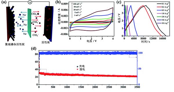 如圖3a所示,使用氮硫共摻雜活性炭作為陽極并且商業(yè)活性炭作為陰極在電解質(zhì)溶液中構(gòu)建的鈉離子電容器裝置。在充電過程中,ClO 4-離子在活性炭的多孔結(jié)構(gòu)中被吸收,而來自電解質(zhì)的Na離子被插入到氮硫共摻雜活性炭中。放電過程與充電過程相反。在制造鈉離子電容器之前,氮硫共摻雜活性炭電極在預活化10個循環(huán)在Na離子半電池中獲得高效率,然后放電至0.01V的截止電壓。此外,研究了活性炭作為陰極的電化學性能,以評估陰極和陽極之間的電荷平衡;钚蕴康谋缺砻娣e高達1500以上。根據(jù)活性炭陰極和氮硫共摻雜活性炭陽極的比容量值,鈉離子電容器中氮與硫摻雜活性炭的質(zhì)量比為3:1。
