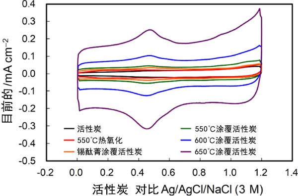 在沒有釩離子的酸性電解質(zhì)中獲得的循環(huán)伏安圖顯示在圖3中。伏安圖中的電流由三個組分組成,即活性炭-電解質(zhì)界面處的電化學雙層充電電流,以及由于表面官能團的氧化還原反應和活性炭表面氧化引起的法拉第電流。電化學雙層充電產(chǎn)生恒定電流和矩形CV形狀。電流取決于基面和邊緣平面的曝光程度,在0.5V附近的寬氧化還原峰和0.8V以上的氧化電流分別歸因于醌/氫醌樣表面官能團的氧化還原反應和活性炭表面氧化。這些電流在熱氧化后增加,并且在錫酞菁涂覆活性炭的熱氧化期間隨著溫度的升高而增加。電化學雙層電流的增加歸因于邊緣平面的暴露,這與拉曼光譜一致。對于錫酞菁涂覆活性炭觀察到的活性炭表面氧化電流意味著高表面粗糙度的發(fā)展。