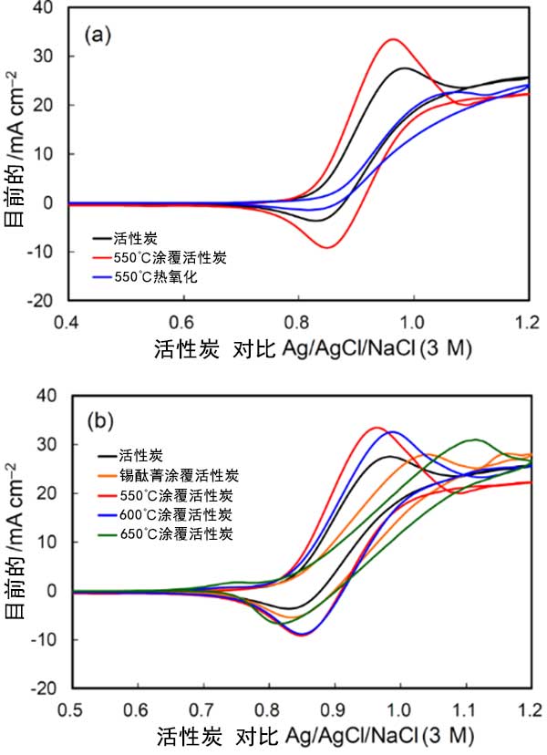 通過在700℃的氬氣中的單步熱處理中通過升華,沉積和錫酞菁的熱解形成的活性炭表面上的含錫碳質(zhì)薄膜的熱氧化,實現(xiàn)了同時的活性炭的納米級表面蝕刻和二氧化錫的負載。這種活性炭對氧化還原液流電池的正極和負極反應起到增強效果,全電池測試顯示充電和放電過程的過電位顯著降低,以及穩(wěn)定的循環(huán)性能。提出了一種基于活性炭表面納米級處理的簡便有效的技術,以顯著提高氧化還原液流電池性能。