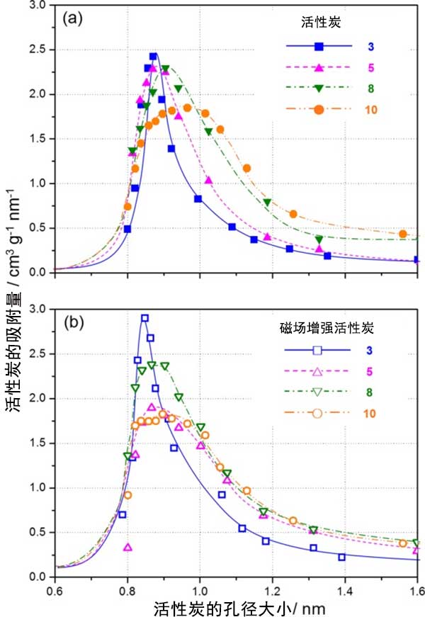 從煤焦油和瀝青制備活性炭的微孔分布,從所獲得的吸附等溫線,在圖3兩種活性炭的孔徑差異非常小相差不到0.04nm,并且在兩種情況下大多數(shù)孔分布在0.80和0.95nm之間。然而,觀察到由磁場增強(qiáng)過的活性炭吸附量在該區(qū)域中大大增加。從吸附等溫線可以估計0.8至0.95nm范圍內(nèi)的總吸附量約為1.25倍。當(dāng)活化劑量加大時兩種活性炭的孔徑分布均發(fā)生變化,產(chǎn)生了略大的孔隙結(jié)構(gòu)。