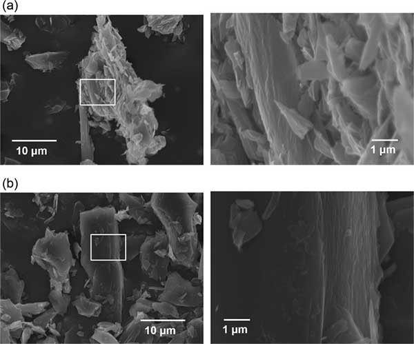 圖4:兩種活性炭的SEM圖像,比率為3的活化劑和前體材料。