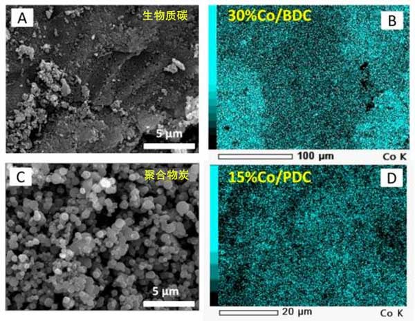 使用掃描電子顯微鏡(SEM)觀察由植物殼和酚醛樹脂的熱解獲得的活性炭的表面形態(tài),并分別在圖1A,C中示出?梢钥闯觯煌奶记绑w產(chǎn)生不同的表面形態(tài)。生物質衍生的碳顯示出剛性和致密的結構,這是典型的木炭特征。而聚合物衍生的碳呈現(xiàn)具有粒子網(wǎng)絡的碳球,在球體之間產(chǎn)生大的空隙。然后將兩種活性炭用作氧化鈷的載體。為了觀察金屬氧化物在活性炭上的分散,進行了SEM與能量色散X射線(EDX)的元素映射。圖1B,D表示裝載在兩種材料中的氧化鈷的代表。所有都顯示鈷材料(在青色中顯示)在活性炭中的均勻分散。這表明通過浸漬方法中描述的簡單化學計量計算很好地實現(xiàn)了元素鈷的目標負載。換句話說,上述結果清楚地顯示了制備氧化鈷活性炭的成功制備步驟。