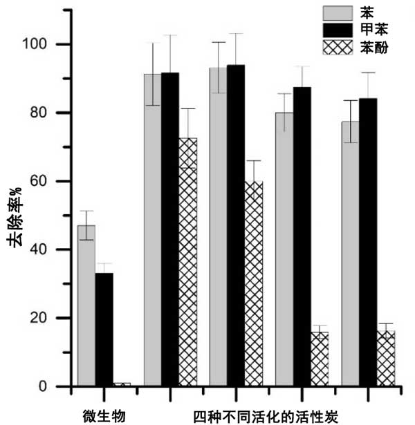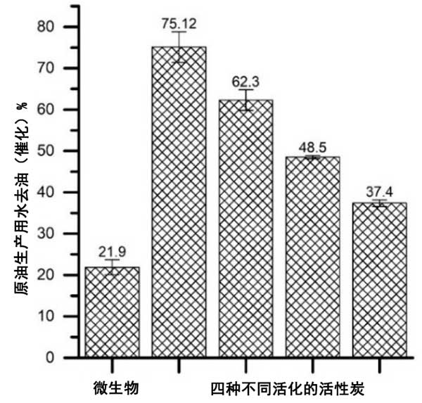 簡而言之,使用活性炭(60%-93%)和載微生物活性炭(16%-84%)比游離的無活性炭載體的微生物(1%-47%)更好地去除芳香烴。材料的孔隙率和吸附偶極性有利于吸附。常規(guī)活性炭表現(xiàn)出高度的微孔性,其中可以容納分子量約為100的苯,甲苯和苯酚;钚蕴康姆菢O性特征保證了碳?xì)浠衔锏氖杷,也是非極性的;钚蕴筷栯x子表面有利于芳烴保留,因為芳環(huán)中的π電子與表面陽離子靜電連接。使用常規(guī)活性炭和載微生物活性炭的原油去除能力如圖3所示。使用游離的微生物和油-鹽水乳液作為對照。