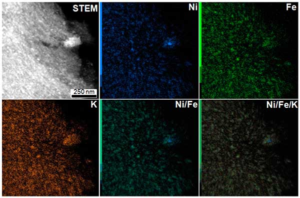 進行EDX映射以獲得有關顆粒的局部化學組成的更多信息。作為示例,圖2呈現(xiàn)了活性炭載鎳材料的EDX映射。如觀察到的圖2中,鎳和鐵,還鉀的存在下,在該材料檢測。這三種金屬的EDX映射的疊加顯示出完美的匹配,表明納米粒子結(jié)構(gòu)中存在所有這些金屬。除小顆粒外,還觀察到一個位于碳末端的大顆粒,并且鎳比其他金屬富集。對于活性炭載銅和銦在顆粒結(jié)構(gòu)中也發(fā)現(xiàn)了鉀的存在。
