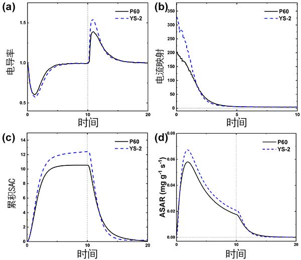 圖2以(a)歸一化電導(dǎo)率曲線表示使用疏水和親水活性炭電極的電容去離子性能。如圖2a所示,在充電步驟期間,與疏水活性炭電極相比,歸一化電導(dǎo)率在親水活性炭電極的情況下顯示出更低和更寬的下降。對(duì)于親水活性炭電極,在充電步驟開始時(shí),圖2b中所示的特定電流也顯得較高。圖2的a,b在電容去離子表明更多離子在充電步驟中的初始幾分鐘吸附在親水活性炭電極的表面上。這意味著在親水活性炭電極上可以更快,更高地吸附鹽。可以推斷,由于水分子更容易進(jìn)入微孔,因此親水活性炭電極上離子的可及表面積大于疏水活性炭電極上的離子的可及表面積。