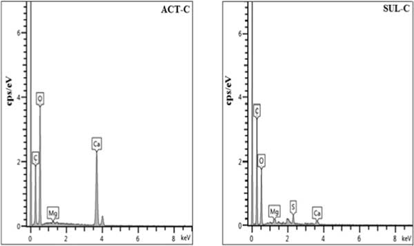 各種尺寸的活性炭和磺化炭的SEM圖像形態(tài)如圖1所示。。ACT-C和SUL-C催化劑的SEM圖像表明,白點代表無機成分。從圖像可以看出,活性炭具有不規(guī)則的致密結(jié)構(gòu),而顆?雌饋硐窬哂泄饣砻娴念w粒。圖2顯示了ACT-C和SUL-C催化劑的EDX圖,并觀察到SUL-C圖中存在硫。此外,在ACT-C和SUL-C的圖中,還有一些額外的峰涉及雜質(zhì),因為碳源是廢物生物質(zhì),因此可能存在這些雜質(zhì)。如圖3所示,通過TEM分析了活性炭和磺化炭的形態(tài)和結(jié)構(gòu)。該TEM圖像ACT-C催化劑的“A”表示僅存在微孔,而SULC催化劑則顯示了“微孔”和“中孔”,這是由于活性炭材料上的磺化作用所致,在活性炭材料中產(chǎn)生了中孔。