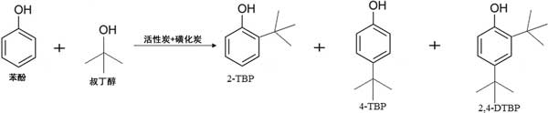 將合成的激活和磺化的活性炭被用于通過苯酚烷基化噸丁基醇。所得產(chǎn)物為2-TBP,4-TBP和2.4-TBP。在圖4中給出了通過叔丁醇使苯酚烷基化的反應(yīng)方案。在90-160 °C的溫度范圍內(nèi)苯酚向單烷基化和二烷基化產(chǎn)物的轉(zhuǎn)化率,并且發(fā)現(xiàn)對于兩種合成的催化劑,在低溫下轉(zhuǎn)化率都非常低,但隨著溫度的升高而降低。增加,苯酚的轉(zhuǎn)化率一直增加到140 ℃。在本研究中合成的活性炭和磺化炭催化劑表明有希望的催化功能。苯酚的最大轉(zhuǎn)化率在140 °C時達到。溫度的進一步升高導(dǎo)致苯酚轉(zhuǎn)化率降低,這可以歸因于較高溫度下烷基化和脫烷基反應(yīng)的熱力學。此外,這還可能與以下事實有關(guān):在更高的溫度下,開始發(fā)生數(shù)個平行反應(yīng),這些反應(yīng)在叔丁醇脫水導(dǎo)致的副反應(yīng)中消耗烯烴,例如低聚,烷基化和裂解。可以肯定的是,高溫下裂紋占主導(dǎo)地位,但這會導(dǎo)致苯酚轉(zhuǎn)化率下降。