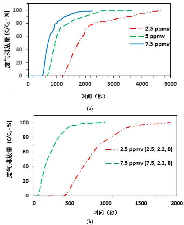 圖2:進(jìn)水氨氣濃度對(duì)活性炭上氨氣吸附突破曲的影響。