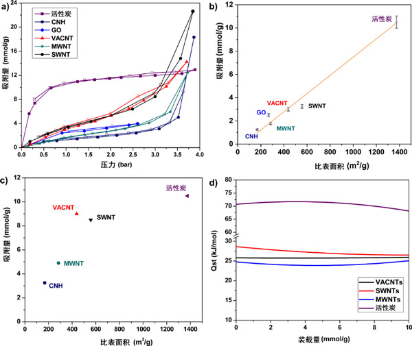 圖1顯示了不同吸附劑的示意圖。活性炭具有無序的孔結(jié)構(gòu)(圖1a),其孔隙度是由基本結(jié)構(gòu)單元的無規(guī)堆積引起的,該結(jié)構(gòu)單元可能是小于10-20環(huán)的平面芳族結(jié)構(gòu),分布在2-4層上或有缺陷的微石墨烯層。具有這種形態(tài),它代表具有擴展的結(jié)構(gòu)紊亂的類型學碳吸附劑。氧化石墨烯具有2D分層結(jié)構(gòu),如圖1b所示。合成氧化石墨烯的起始材料是石墨,石墨的氧化引入了氧官能團,繼而增加了層間距并使材料變成親水性。隨后的剝落步驟將各層分開,從而顯著增加其可訪問的表面積,從而導致單層或少層氧化石墨烯的形成。在我們以前的工作中,通過XPS分析,我們發(fā)現(xiàn)氧化石墨烯上存在的氧官能團是羥基和羧基的形式。材料在孔隙率和功能化程度方面的可調(diào)性使氧化石墨烯成為親水性碳吸附劑的原型,因此對于研究2D材料中的氣體吸附也很有趣。碳納米角具有管狀結(jié)構(gòu),在一端具有封閉的錐形尖端結(jié)構(gòu)(圖1c)。單個碳納米角通常為單壁,內(nèi)徑為2-4 nm。碳納米角的獨特特征是直徑為50–100 nm的剛性球形聚集結(jié)構(gòu)。合成后的碳納米角關(guān)閉,氣體分子無法進入碳納米角內(nèi)部。氧化處理,例如在空氣中加熱,O 2 或CO 2用于打開碳納米角,從而將可及表面積增加3-4倍。碳納米角具有微孔的組合,對于氣體吸附應(yīng)用很有趣,因為它們可以大量生產(chǎn)且純度高。