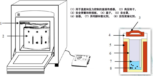 圖1是實驗室設置的示意圖。微波消解實驗站用于產生微波能量。在標準反應運行中,將10 mL異丙醇溶液轉移到100 mL鐵氟龍容器中。在攪拌下將所需體積的過氧化氫溶液(30%)注入到容器中。然后,將一定量的活性炭催化劑添加到該異丙醇溶液中,并在微波消解實驗室站中照射120秒。在所有實驗中,溶液溫度均保持在80±2°C,MW功率保持在600W。