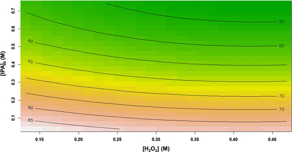 圖2顯示了總有機碳去除效率百分數(shù)與H 2 O 2濃度和初始異丙醇濃度的關系。從響應輪廓中可以看出,將異丙醇初始濃度從0.038 M增加到0.743 M,導致TOC去除率從85.17%急劇降低到46.29%?赡苁且驗樵谙嗤膽梅磻獥l件下,自由基(OH•)的數(shù)量保持恒定,而初始異丙醇濃度卻增加了。換句話說,相對較少量的氧化基團可用于攻擊異丙醇分子。類似地,總有機碳降解性能也隨著H 2 O 2濃度的增加而逐漸降低。過量的H 2 O 2可能促進自動清除反應的發(fā)生。