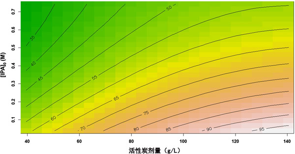 圖3:活性炭劑量和異丙醇初始濃度的相互作用效應及其對總有機碳去除率的影響。過氧化氫的濃度保持恒定在0.3M。