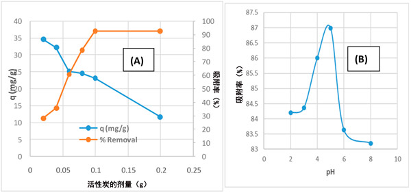 我們研究了不同參數(shù)對活性炭去除乙酰胺的影響,例如吸附劑的劑量,pH,乙酰胺的初始濃度和接觸時(shí)間。吸附劑的用量是吸附過程中的重要參數(shù),因?yàn)樗鼪Q定了系統(tǒng)中吸附劑與被吸附物的平衡以及給定濃度下吸附劑的容量。吸附劑劑量對由活性炭去除啶蟲脒的效果在不同的吸附劑的劑量從0.02-0.2克/100毫升變化進(jìn)行了研究,如圖1。隨著活性炭吸附劑劑量的增加,對乙酰胺的去除百分率從27.8%增加到92.5%。這可以歸因于活動(dòng)站點(diǎn)數(shù)量的增加。在較高的吸附劑量下,由于聚集體的形成,吸附位點(diǎn)的使用不完全。與去除百分率相反,隨著吸附劑劑量的增加,活性炭對乙酰胺的吸附能力下降了一些。注意到在0.1g的吸附劑劑量之后,吸附效率沒有顯示出顯著的增加,這表明了吸附位點(diǎn)的飽和。對于通過活性炭去除乙酰胺實(shí)驗(yàn)而言,0.1 g的吸附劑量似乎是合適的。