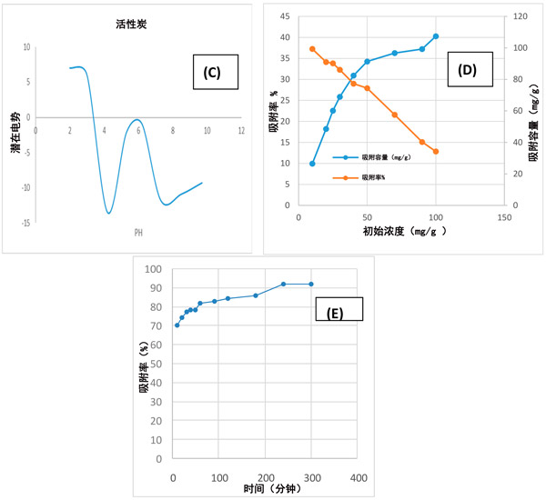 圖1:(A)吸附劑劑量的影響;(B)pH;(C)活性炭的電勢;(D)乙酰胺的初始濃度;(E)通過活性炭除去乙酰胺的接觸時(shí)間。