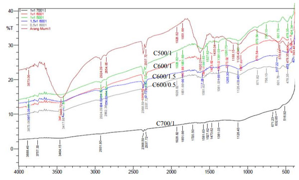 對于峰的強度,活化溫度在降低強度中起重要作用。較高的溫度將產(chǎn)生具有較少官能團(tuán)的活性炭。最高活化溫度樣品顯示幾乎平坦的光譜。同時,對于活化劑定量,效果很小。比率從0.5增加到1.5似乎對樣品的化學(xué)性質(zhì)沒有任何影響,因為三個光譜相似。