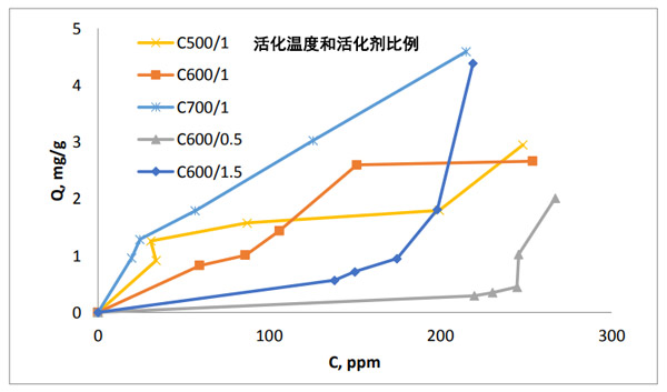 從圖2中可以看出,活性炭在不同的活化溫度(500℃,600℃和700℃)和活化劑比率(0.5、1.0和1.5)下的鋰吸附等溫線。似乎在較低濃度下吸附能力相對較低。這表明鋰離子對活性炭表面的親和力低。高濃度下容量的增加與孔隙率成正相關(guān)。活性炭的較大表面積傾向于更多地吸附鋰離子。在等溫線的分類中,該等溫線被認(rèn)為是III型等溫線,對于無孔或大孔吸附劑來說是典型的。因此,鋰離子似乎不附著在微孔內(nèi)部,而是附著在外部和大孔表面。活性炭對鋰離子的親和力低。炭表面的碳原子與溶液中的鋰離子之間的低相互作用可能是由于離子的原子質(zhì)量低所致。原子間勢相互作用表明該力與相互作用原子的原子質(zhì)量以及原子之間的距離具有正相關(guān)。
