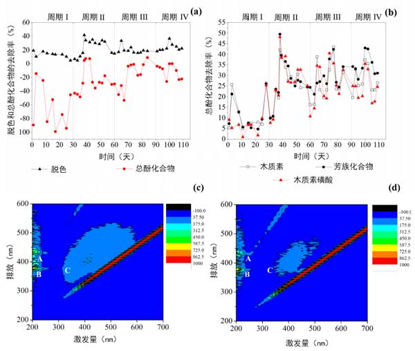 圖2:(a)去除顏色和總酚類(lèi)化合物。(b)去除木質(zhì)素,芳族化合物和木質(zhì)素磺酸化合物。(c)富集的熒光發(fā)射和激發(fā)矩陣。(d)廢水排放和熒光激發(fā)矩陣。