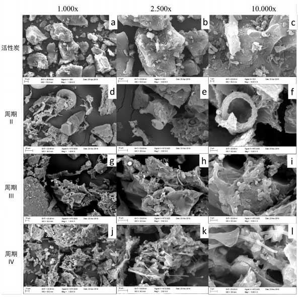觀(guān)察圖3所示的圖像,處理期間生物量顯著增加,其中存在大量生物材料,可能的絲狀形成和微生物團(tuán)聚,表明存在較大量步驟IV中的生物量。至于生物膜的發(fā)展,觀(guān)察顯微照片增加了10,000倍(圖3C,3I和3L),注意到附著在活性炭表面的微生物的生長(zhǎng)。這些可能是細(xì)菌,真菌和絲狀細(xì)菌,活性炭在反應(yīng)器運(yùn)行110天后,固體樣品中的細(xì)菌含量更高。