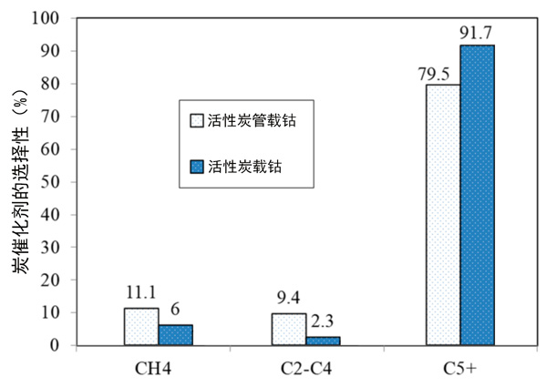 費(fèi)托合成試驗(yàn)是在210℃和2.5MPa的內(nèi)徑為12mm的不銹鋼固定床管式反應(yīng)器中進(jìn)行的。將0.5g催化劑與5.0g碳化硅稀釋劑的反應(yīng)混合物裝入反應(yīng)器中。催化劑在425℃下在N2中的33vol%H2中原位還原10小時(shí)。還原后,將反應(yīng)器冷卻至180℃,并將H2/N2氣體混合物切換為合成氣(H2:CO為2∶1)。在合成氣加壓至2.5MPa然后在4小時(shí)內(nèi)重新加熱到210°C來完成反應(yīng);钚蕴枯d鈷催化劑,活性炭納米管載鈷催化劑的CO轉(zhuǎn)化率分別為13.1%,6.7%。產(chǎn)物選擇性的結(jié)果在圖2中給出。與活性炭管樣品相比,活性炭產(chǎn)生更高的C5+和更低的CH4選擇性,這對氣體產(chǎn)物(C1-C4)也產(chǎn)生最高的選擇性。