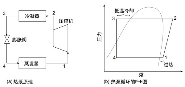熱泵是空調(diào)的熱力學(xué)原理,可以基于狀態(tài)點(diǎn)的熱物理特性來(lái)預(yù)測(cè)熱泵的熱力學(xué)性能。圖2(a)顯示了典型熱泵的示意圖,圖2(b)顯示了壓力-焓線(xiàn)圖上的熱泵循環(huán)。在我們的模擬中,不僅計(jì)算了每種狀態(tài)下的熱物理性質(zhì),而且還計(jì)算了蒸發(fā)器和冷凝器中的熱交換過(guò)程。由于換熱器規(guī)格的可用性限制,所以將換熱器建模為雙管逆流式換熱器,該換熱器用于我們的實(shí)驗(yàn)裝置中。
